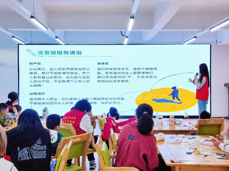 则徐人才实验班班的气象科普结束后,福建师范大学法学院4班团支部成员们以生活中常见的场景为例,让小朋友在思考中学习相关法律知识,把法律条文拆解为易懂的“大白话”。这场贴近生活的法治课,潜移默化中培养了小朋友们的维权意识,加深了他们对日常法律知识的学习。