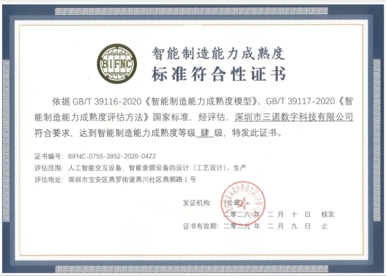 近日,三诺数字旗下三诺智慧声谷成功通过国家《智能制造能力成熟度模型》标准评估,荣获金砖国家未来网络研究院中国分院(BIFNC)颁发的智能制造能力成熟度四级(优化级)认证。作为金砖国家框架下专业的ICT与产业数字化评估机构,BIFNC经深圳市政府认可,具备权威资质。据悉,在该机构的评估系统下,中国尚无智能制造能力成熟度五级获得者,四级是目前事实上的最高级别。